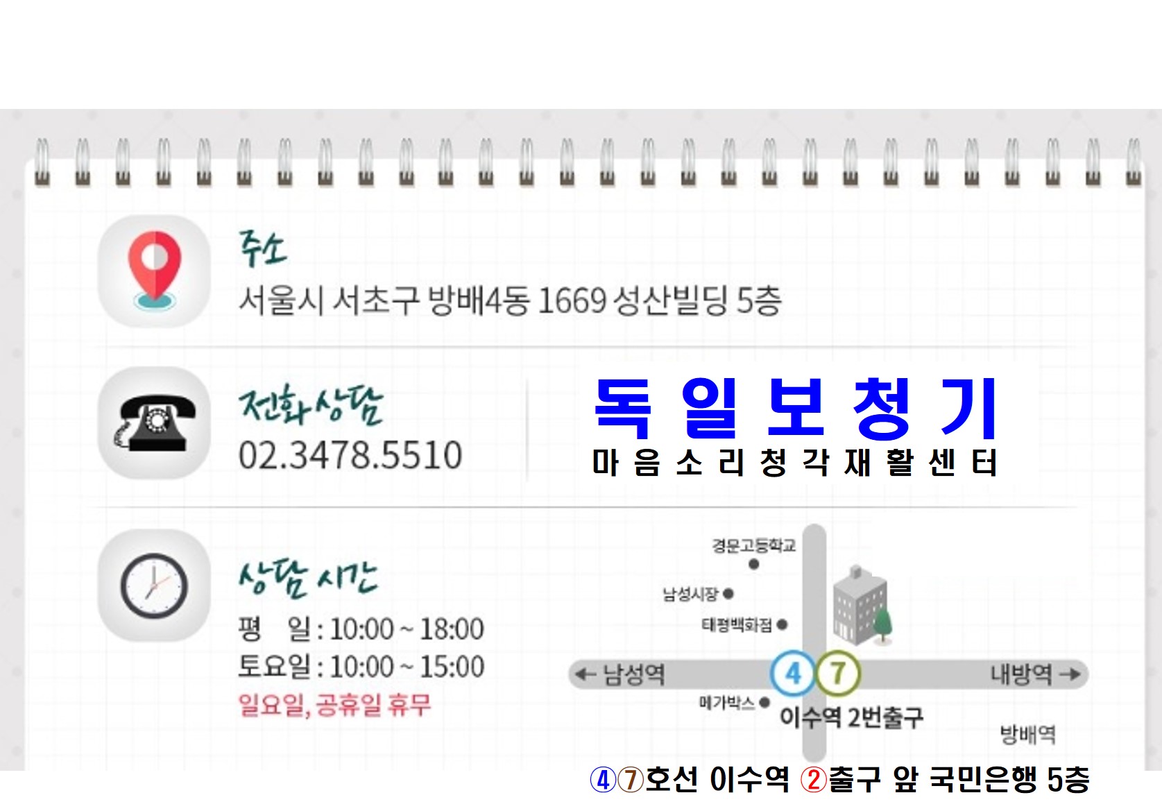 | 주소 | [06568] 서울 서초구 동작대로 120 (방배동) 5층 독일보청기(이수역 2번출구) | ||