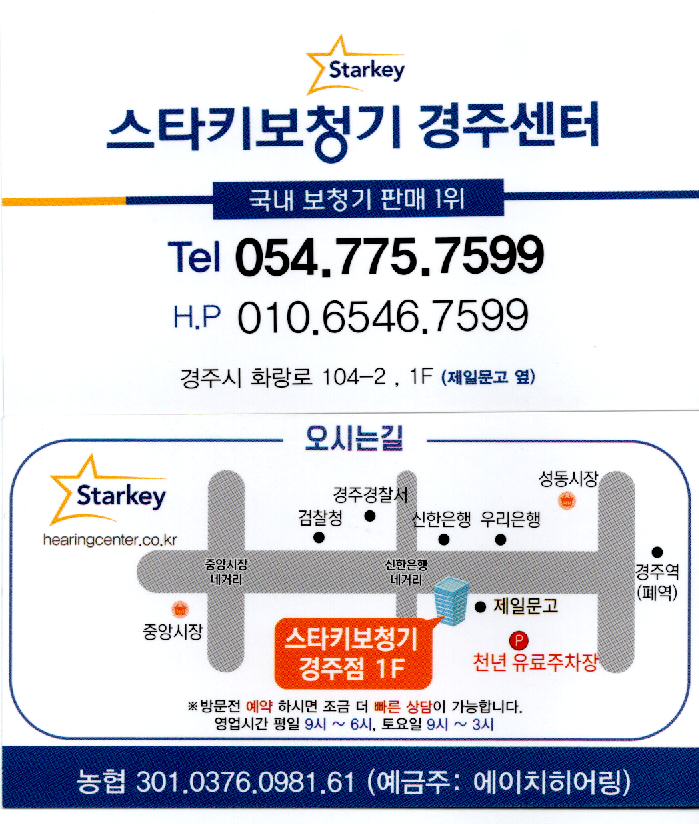 경주 스타키보청기 에이치히어링(주) 입니다. 평일 9:00~18:00 토요일 9:00~15:00 공휴일 휴무 주차 : 천년주차장 |