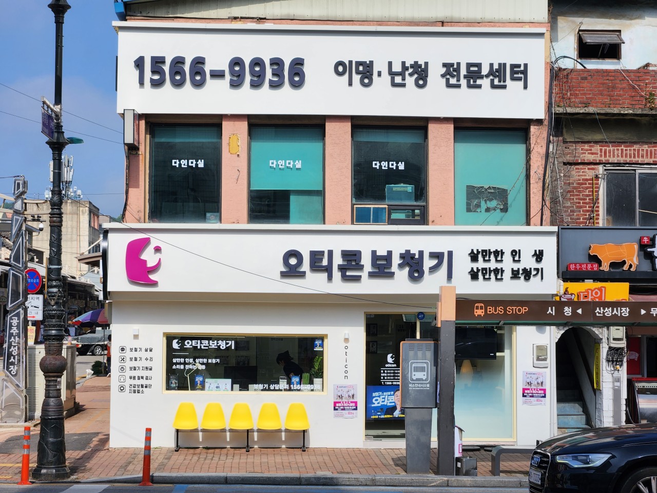 | 찾아가는길 도보 - 산성시장 입구 쪽 중앙약국 옆 위치 대중교통 - 산성시장(58002, 58003, 옥룡동/공주고방면, 산성동/시내버스정류장방면, 산성동구터미널 방면) 정류장 하차 후 산성시장 입구에 위치한 오티콘 보청기까지 도보로 50M 내 차량 - 공주축산농협 산성지점주차장입구 - 이용요금 : 무료 (2시간 주차 등록 가능) |
